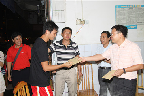 公司黃鼎龍董事長(右一)、藍書記(右二)給球員頒發(fā)獎金